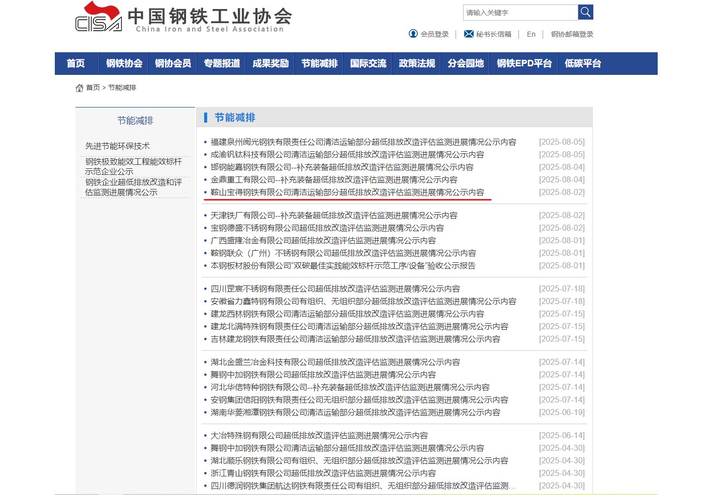 2025年8月2日,中國鋼鐵工業(yè)協(xié)會對鞍山寶得鋼鐵有限公司超低排放清潔運輸改造和評估監(jiān)測情況進(jìn)行了公示,寶得鋼鐵有限公司成為鞍山市除鞍鋼外首個完成超低排放清潔運輸改造和評估監(jiān)測工作的企業(yè),標(biāo)志著公司超低排放改造項目取得重要階段性成果。不僅為企業(yè)可持續(xù)發(fā)展奠定了堅實基礎(chǔ),也為鞍山地區(qū)的環(huán)境保護(hù)作出了積極貢獻(xiàn),是企業(yè)履行社會責(zé)任的生動實踐。